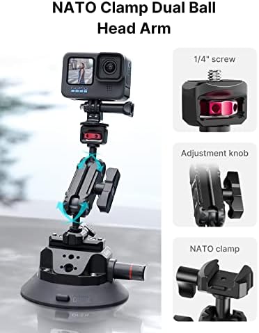 【NATO Rail Magic Arm】NATO camera mount able to quick install on and release from the suction base; durable metal material give camera strong supper; dual 360°ball head allows to adjust the angle at will; includes a action cam adapter, enable to work with gopro/dji action 3