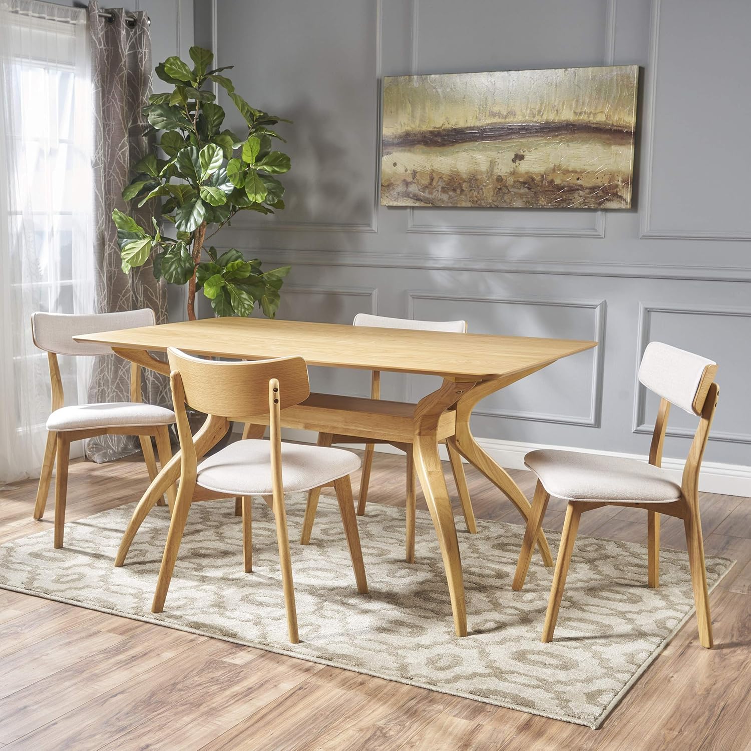 Christopher Knight Home Nissie Mid-Century Wood Dining Set with Fabric Chairs, 5-Pcs Set, Natural Oak Finish / Light Beige