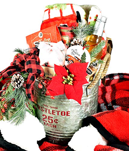 This very special Christmas gift basket is simply stunning! It was designed to ignite a sense of nostalgia and encourage a cozy Christmas morning, sitting in front of the Christmas tree, being warmed by the fire. The wonderful gift basket arrive artfully arranged in a large designer metal holiday planter from the MudPie company.Intended to bring the holiday season alive, this large Christmas gift basket is going to conjure up memories of Christmas’s past and make some new ones too. Any family or really special individual lucky enough to be on the receiving end of this holiday gift are really going to appreciate it.This amazing, unique, one-of-a-kind Christmas gift basket features:Large, Galvanized Tree Farm Themed Metal TubA Large, Oh so Soft and Cozy Holiday BlanketChocolate Royale Hot Cocoa Mix in a Festive Holiday BoxIrish Cream CoffeeAssorted BiscottiChocolate Hazelnut Cream Filled Wafer CookiesChocolate Truffle CookiesA Bottle of Delicious Flavored Coffee SyrupA Matching Keepsake Christmas Tree OrnamentSend to friends and family when you can’t be there to celebrate the holidays with them and they will get a holiday delivery they won’t forget. This large Christmas gift basket will be marveled at before it gets opened up, explored and enjoyed.