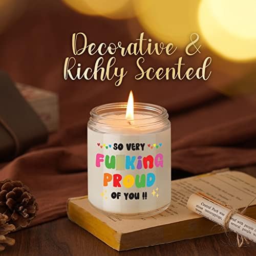 You cannot have too much self pride and it’s a great sentiment to share; Show your loved ones that you’re impressed with their success with this proud of you candle gift; This soy candle with a saying, “so very f proud of you” makes a lovely gift for your best friend, bestie, bff, girlfriend, daughter, daughter in law, granddaughter, sister, wife, mom, niece, partner, coworker, teenager, employee, boss or any special lady in your life