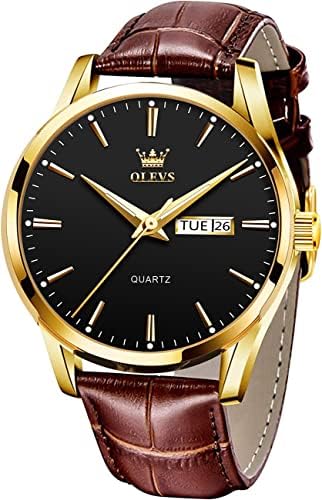 OLEVS Watches for Men Brown Leather Gold Case Analog Quartz Fashion Business Dress Watch Day Date Luminous Waterproof Casual Male Wrist Watches